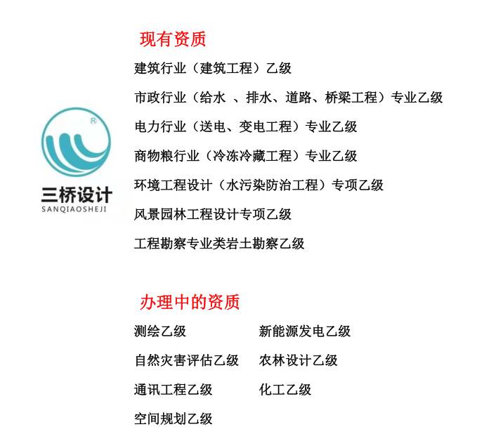 三桥自成立以来已经拥有了一批优良的资质,其中包括:建筑行业(建筑工程)乙级,市政行业(给水、排水、道路、桥梁工程)专业乙级,电力行业(送电、变电工程)专业乙级,商物粮行业(冷冻冷藏工程)专业乙级,环境工程设计(水污染防治工程)专项乙级,风景园林工程设计专项乙级,岩土勘察(岩土工程)乙级资质也拥有了一批优质的客户。现在我们勘察的备案也在进行中,最近我们完成了广东的勘察备案,接下来我们就可以用勘察资质在广东接项目啦!